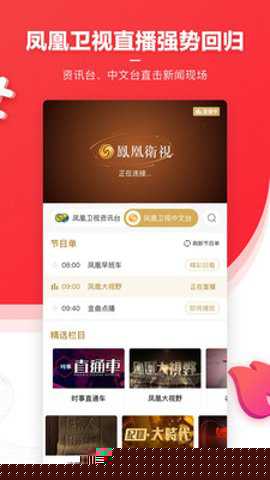 登录后,在软件首页顶部导航栏进入直播频道,即可观看正在播出的凤凰卫视中文台实时信号,节目单会提前更新。
