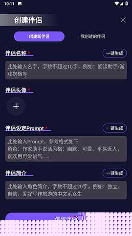 在创建新对话对象时,系统提供详细的设定选项,包括基本信息、性格描述与语言风格,用户可根据个人偏好自由组合,塑造独特的互动伴侣。