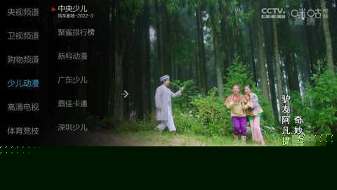 在智能电视或机顶盒上完成安装后启动。主界面按频道类型分类,可通过遥控器方向键浏览。