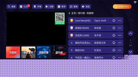在智能电视软件商店搜索并完成安装。启动后可使用手机扫码绑定作为点歌器。