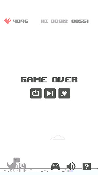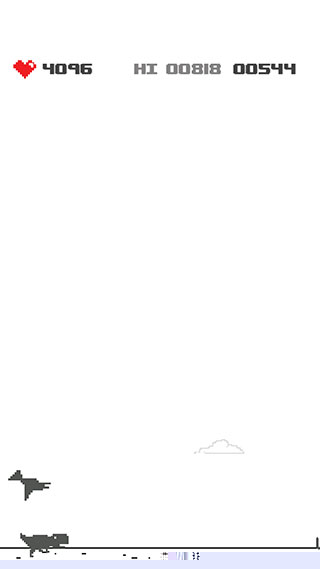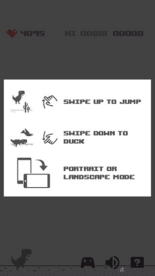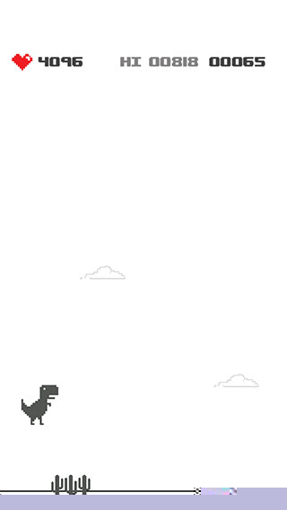 启动软件后,点击中央播放按钮即刻开始奔跑。通过向上滑动屏幕指令使恐龙跃过地面仙人掌。