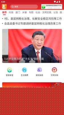 打开软件后,首页即为资讯推荐流,可通过顶部分类标签如时政、乡镇等筛选,或直接使用搜索功能查找特定内容。