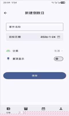 记账时需选择收支类型并填写金额;记物功能要求录入物品名称及相关备注;设定倒数日则需选择目标日期并命名事件。