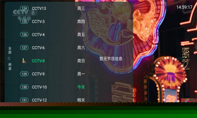 选择目标频道即可开始观看直播。部分频道支持节目回看与播出预约功能。