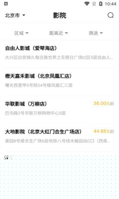 启动软件后,系统将基于地理位置展示周边影院列表。用户可根据日期、影片或特定服务(如可退票标识)进行筛选。