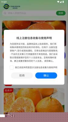 首次启动需阅读并同意用户协议。在登录界面选择合适方式完成账户注册或绑定。进入主页面可浏览实时柑橘供应与采购信息。参与竞拍需设定相关参数并关注出价动态。成交后系统将自动生成电子合同并引导完成支付与物流安排。