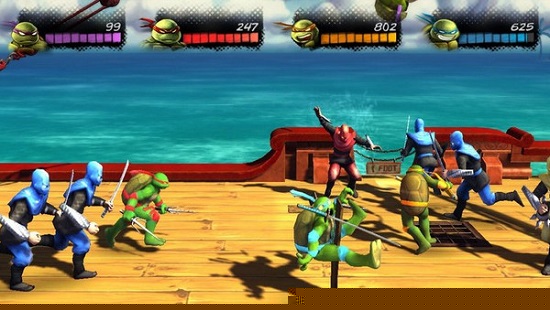 面对群体敌人时,善用场景中的可互动道具,如油桶或飞掷物,能有效打破包围。部分关卡设有机关谜题,需要切换不同角色利用其特性(如多纳泰罗的长棍触发远处开关)协作通过。