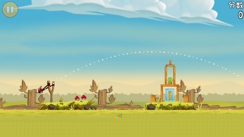 操作时,在弹弓处向后拖动手指调整力度与角度,抛物线轨迹辅助瞄准。