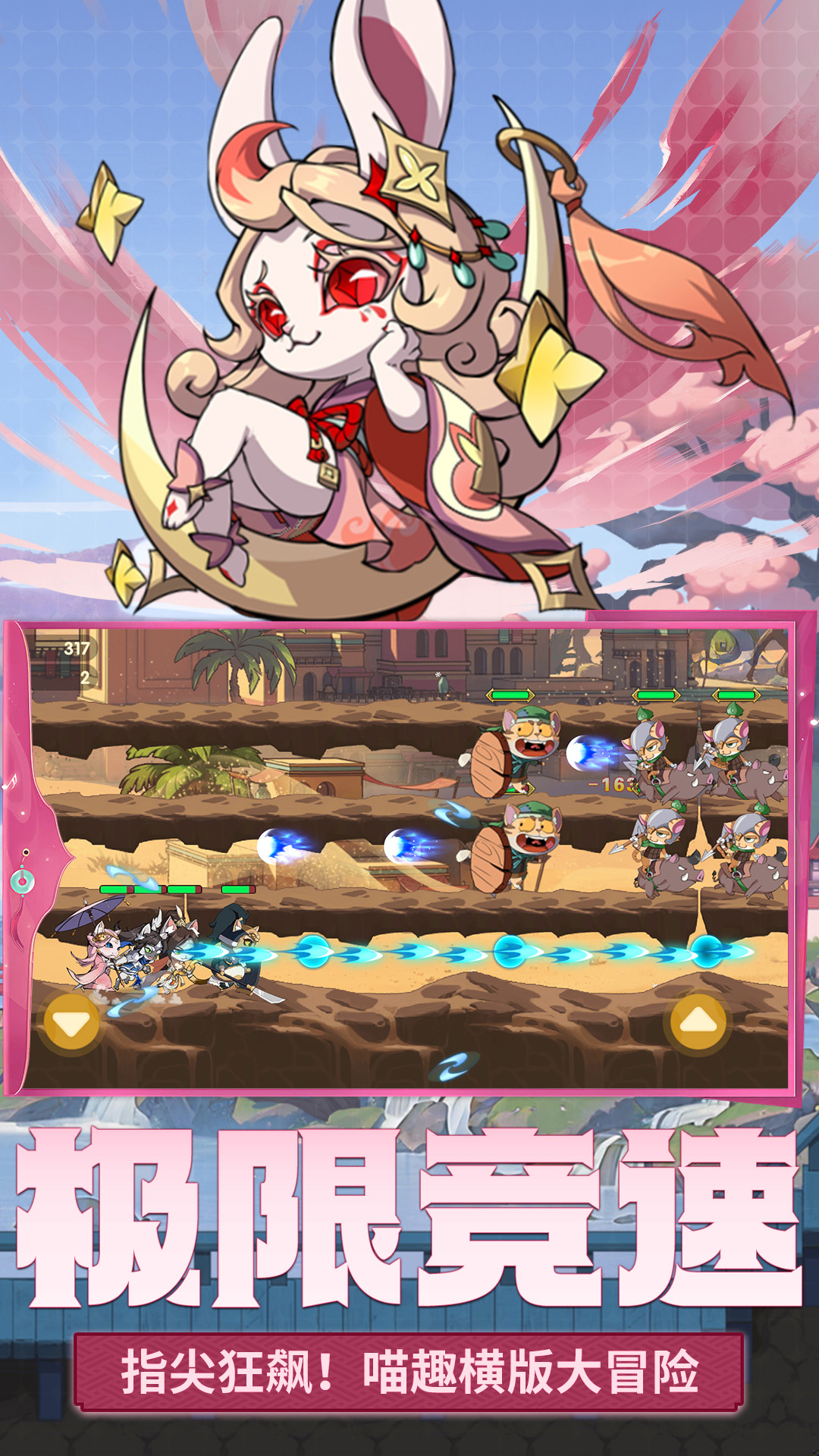 最强追逐是一款以萌猫元素为核心的跑酷冒险弹幕射击游戏,将组建一支萌猫小队,穿越不同历史场景,在高速移动中收集宝物、躲避弹幕并击败沿途敌人,解锁多样角色与技能,体验一场融合了策略与操作的快节奏冒险旅程。
