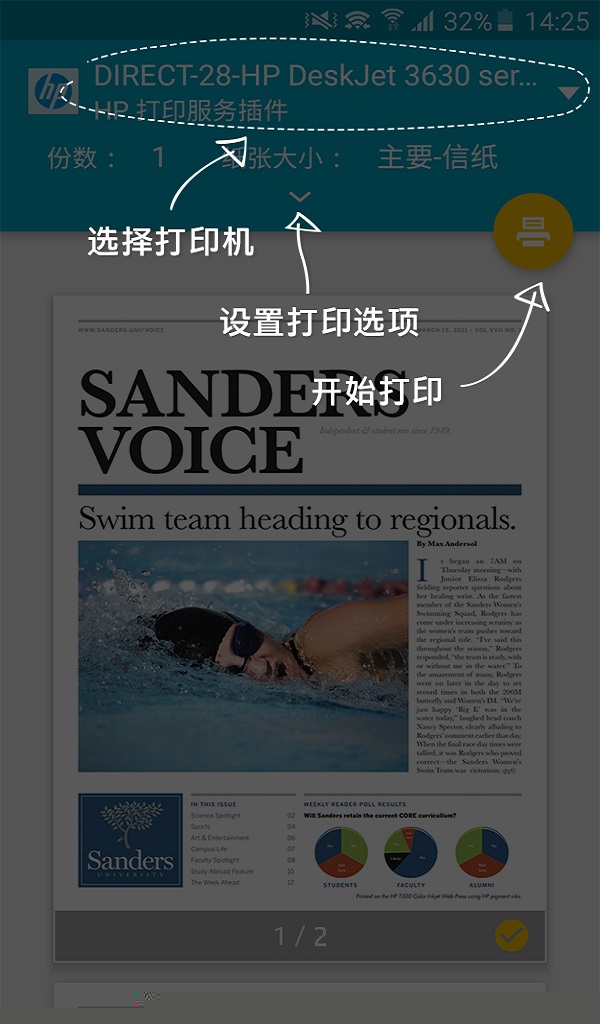 在支持打印的软件内,点击分享或菜单键,选择打印选项并选取已配置的惠普打印机即可完成输出。