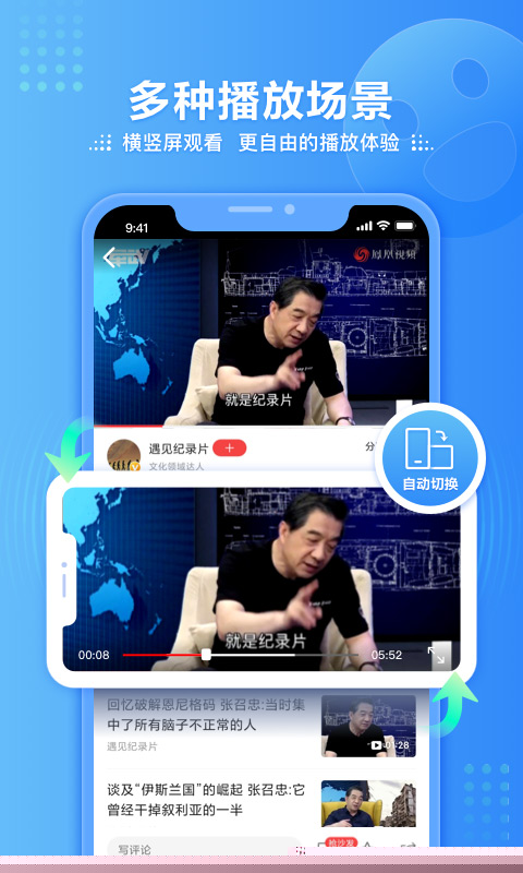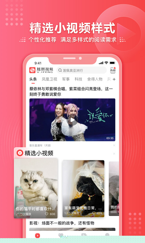 凤凰视频是一款集新闻资讯、热点直播与生活娱乐于一体的视频聚合软件,通过智能推荐算法为用户提供个性化内容,覆盖全球热点事件与生活趣闻,支持多终端同步观看,满足移动场景下的信息获取需求。