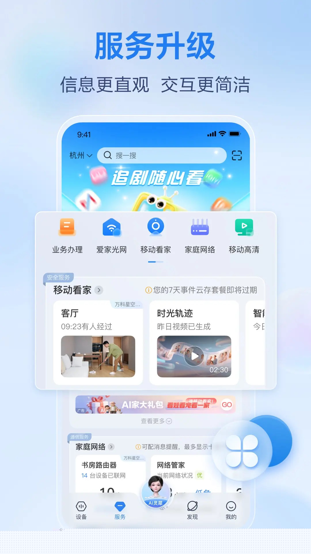 移动爱家是一款由中国移动推出的智慧家庭综合管理软件集成了家庭设备控制、网络状态监控、业务在线办理及家庭成员互动分享等核心功能。通过整合安防、健康、娱乐等多元化生活服务,为用户构建一个高效、便捷且富有品质的智能家居生态。