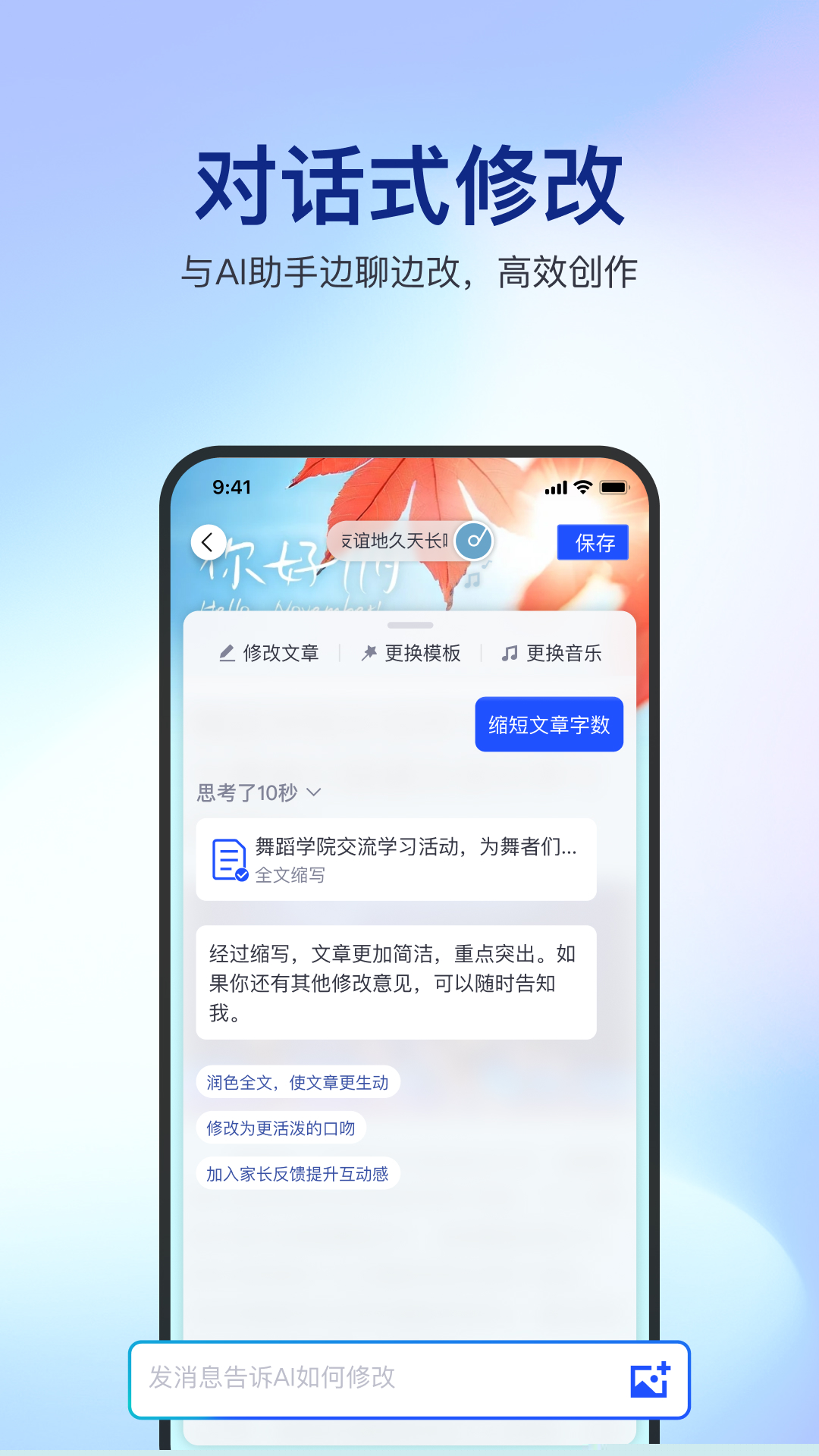 利用侧边栏的AI助手对话功能,输入对布局、风格或色彩的调整意向,获取优化建议并快速软件。可在预览界面实时查看效果。