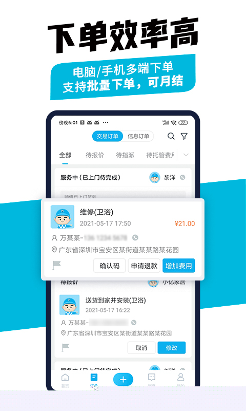 系统将根据订单需求自动匹配并派发给附近合适的认证师傅,企业可实时跟踪订单状态与进度。