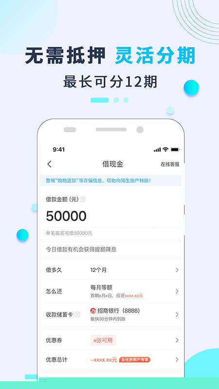 系统将进行自动化审批,快速反馈授信额度。获得额度后,即可根据需求选择分期期数并提交借款申请,资金将快速到账。