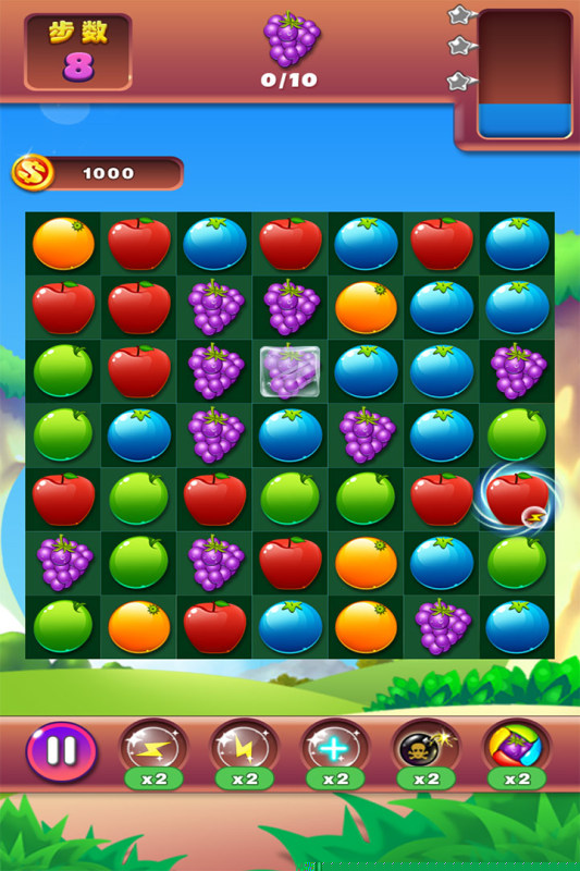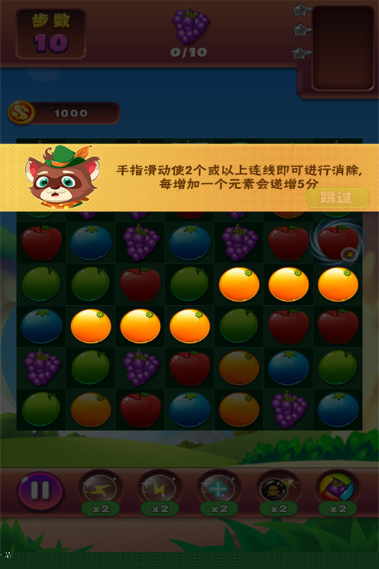 进入场景后,通过手指滑动连接三个及以上相同水果完成消除。