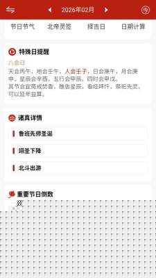 观吾道历是一款深度整合传统道家历法文化与现代生活场景的智能软件,其核心功能围绕黄历查询、节气养生、择吉决策与身心调养展开,通过严谨的天文历算与生活化解读,为用户提供兼具文化内涵与实用价值的日常指引,帮助用户在快节奏生活中建立与自然节律的和谐连接。