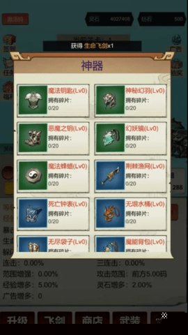 飞剑进阶、神器收集与装备搭配构成核心成长线。