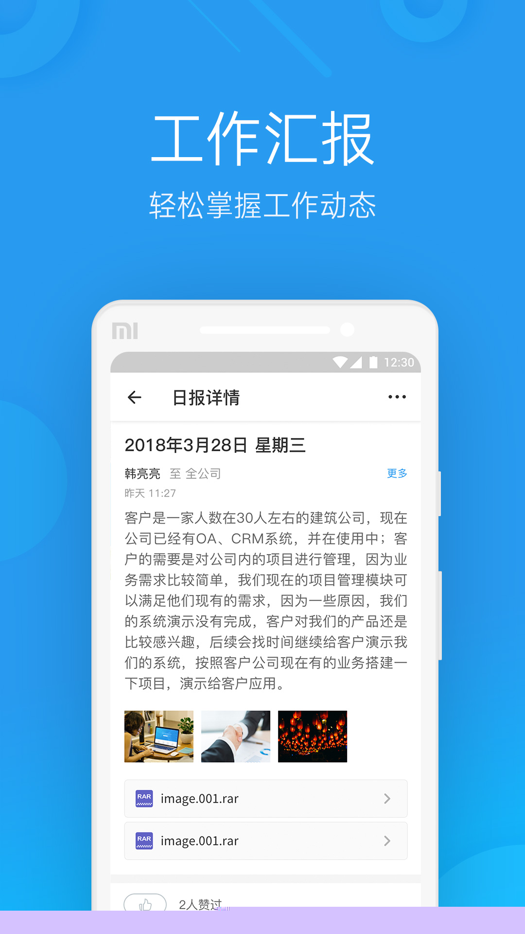 员工通过移动端软件接收任务提醒,使用外勤签到功能提交带水印的工作汇报。