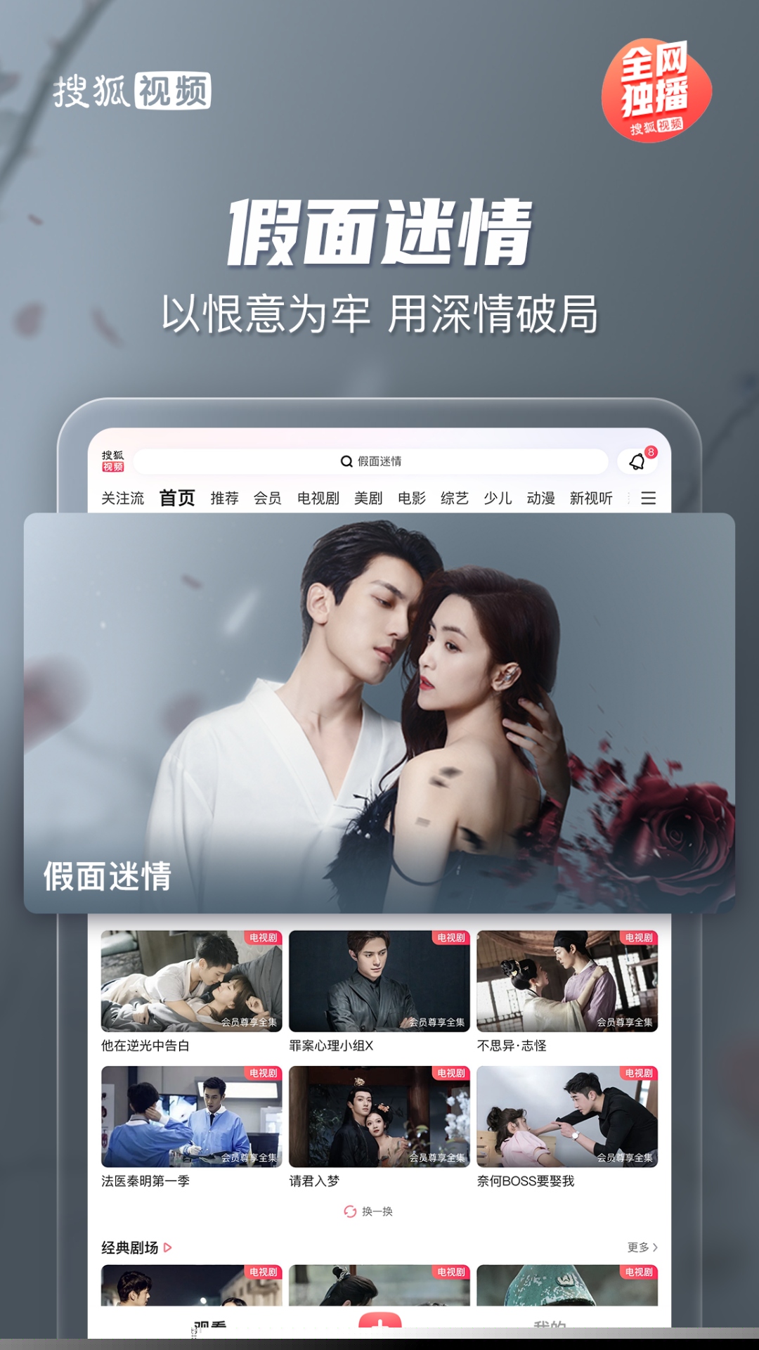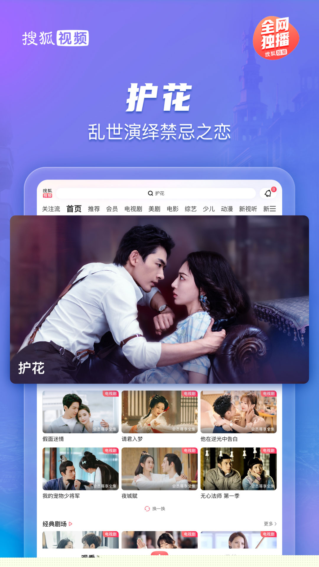 在软件内搜索剧集名称,如护花、夙夜集,带有独播标识的内容即为平台独家提供,点击即可在线播放或下载。