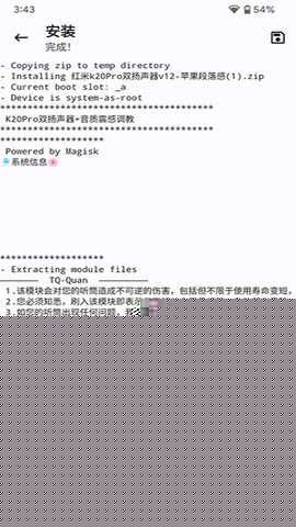 进入模块管理界面,通过悬浮按钮选择本地存储的模块文件进行刷入,操作完成后根据提示重启设备以使模块生效。