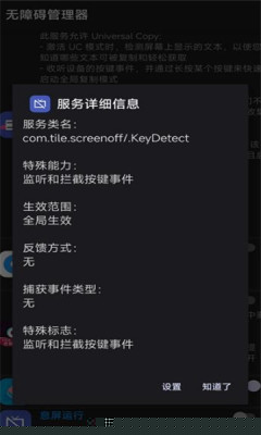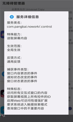 点击任一服务可查看其详细信息,包括是否具备读取屏幕内容、拦截按键等能力。在此界面可直接启用或禁用该服务,管理逻辑独立于系统原生设置。
