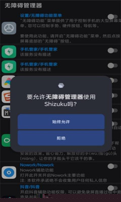 首次启动需根据指引,通过Shizuku、Root权限或电脑ADB方式授予必要的安全设置写入权限。授权成功后,主界面将清晰展示当前设备所有可用的无障碍服务列表。