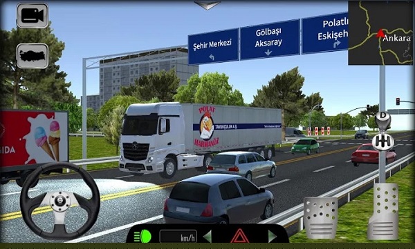 从货运站领取任务,规划路线,驾驶过程中需持续关注速度表、信号灯与线路坡度。