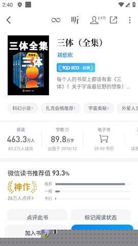 完成安装后,使用微信账号授权登录。在主界面浏览或搜索感兴趣的书籍,点击加入书架。