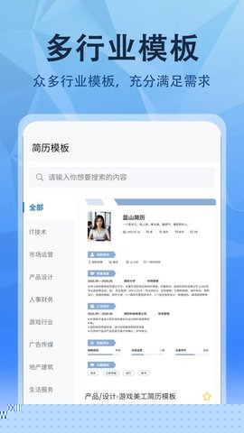 完成安装后,进入软件主界面。根据自身所属行业或目标职位进行筛选,浏览系统推荐的简历模板。