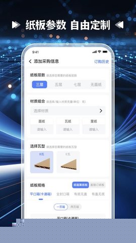 于商城板块筛选纸板,确认规格与数量后提交订单并支付。
