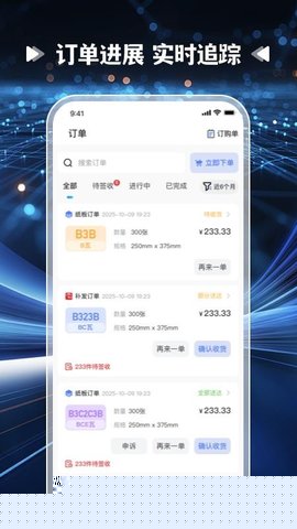 所有订单均保存在我的订单模块,可按时间、状态进行筛选,点击任一订单可查看详情,包括产品参数、价格、物流轨迹等。