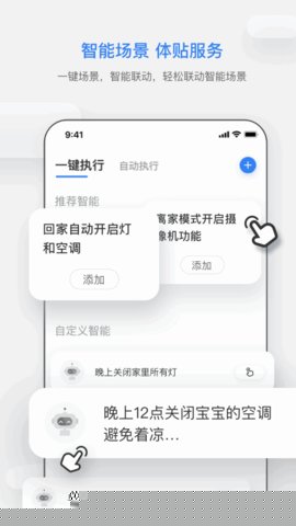 在场景功能中,组合已连接的设备并设置触发条件与执行动作,保存后即可一键启用。