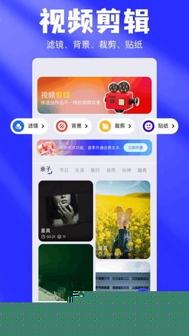 进入编辑中心,选取素材后可调用时间轴剪辑、滤镜特效及背景替换等功能,模板库提供多种风格预设。