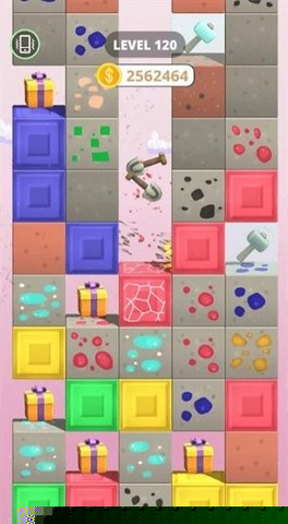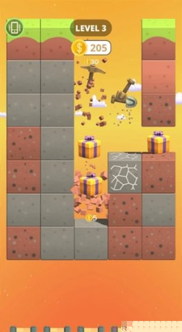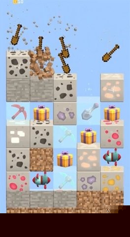 进入场景后,持续点击屏幕即可破坏砖块并收集散落的矿物资源。