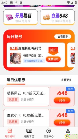 进入福利专区,浏览并选择感兴趣的各类福利充值卡进行领取。