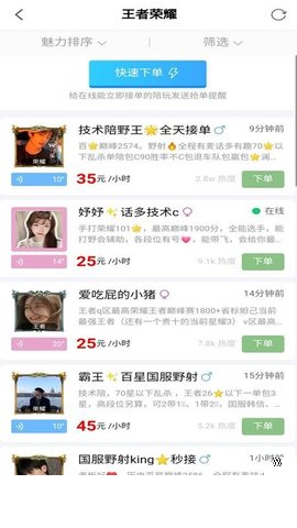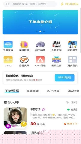 陪玩是一款专为游戏爱好者设计的社交娱乐软件,通过连接专业游戏陪玩与普通,提供个性化的游戏陪伴、技能指导与互动体验,覆盖多款热门游戏,帮助用户在娱乐中提升操作水平,结识游戏伙伴,丰富线上社交生活。