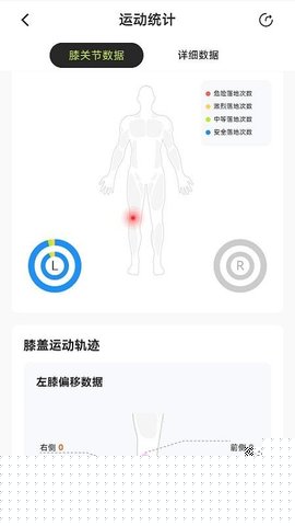 核心分析运动时长、距离、步数、跳跃能力,并对膝关节的前后及左右侧向偏移趋势进行专业评估。