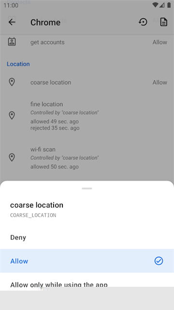 可对权限进行忽略、仅在使用时允许等高级别设置。