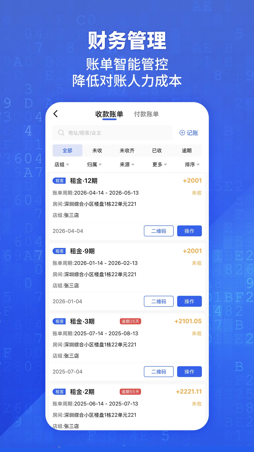发布后可在租务模块查看租客信息、合同状态及租金支付记录,系统会自动发送租金到期提醒。