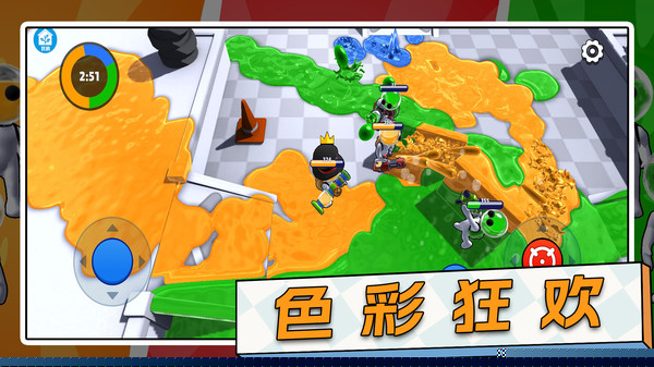 战斗核心是使用染色子弹攻击对手并覆盖地图。成功命中会触发慢动作回放,被颜料覆盖的区域将转化为己方领地,直接影响战局优劣。