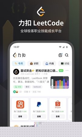内置讨论区允许用户交流解题思路与面试经验,形成互助学习氛围,提升学习持续性。