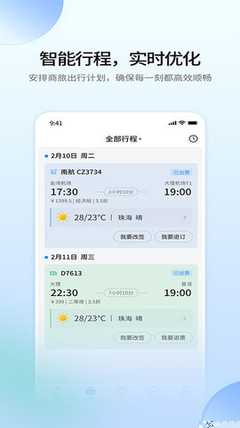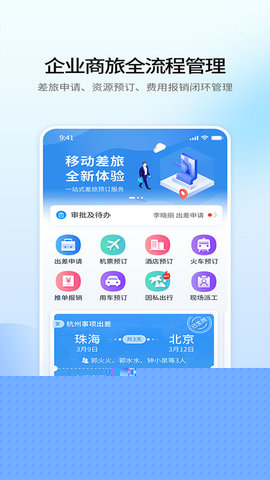 提交出差申请后,系统将自动关联审批流程,用户可在软件内一站式完成机票、酒店等资源的预订。