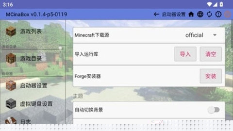 MCinabox是一款专为移动设备设计的我的世界Java版启动器通过深度适配安卓系统,将原汁原味的PC端游戏体验完整移植到手机平台,核心在于解决了Java版游戏在移动端的运行难题,支持游戏本体、模组、资源包及自定义参数的管理,让能够随时随地构建和探索个性化的方块世界。