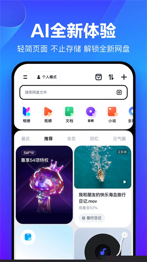 主界面仅保留文件管理、传输任务等核心入口,去除了发现页、金融借贷等与文件存储无关的功能板块。