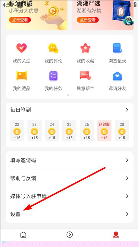 2、进入用户中心页面,用户可查看积分、优惠券、关注、评论、收藏、浏览记录等,下拉找到设置;