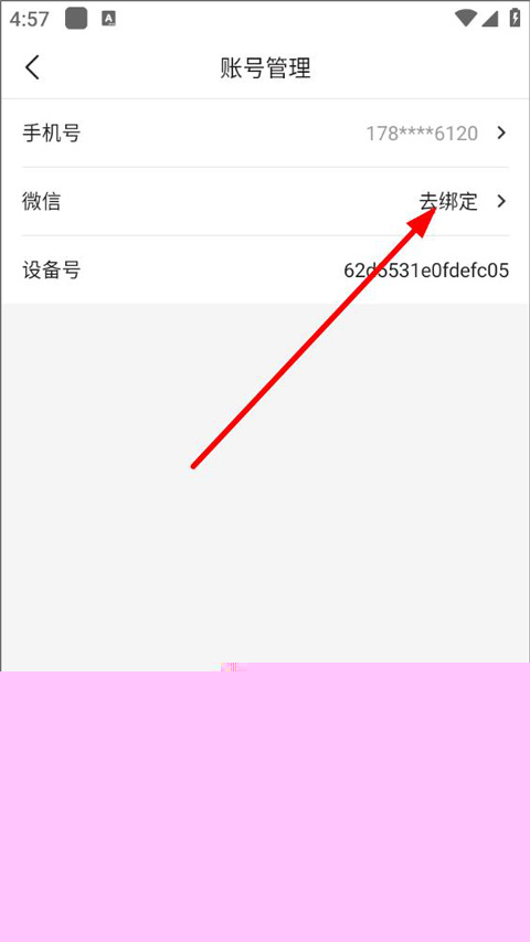 4、进入账号管理页面,用户可更换手机号,查看设备号,点击微信去绑定即可。