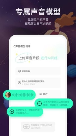 训练专属声音模型:在声音训练模块中,上传清晰、无背景噪音的亲人录音,会对音频进行分析和学习。完成后,您可以在该模块试听AI生成的语音样本,并根据个人感受进行细微调整,以达到最满意的效果。