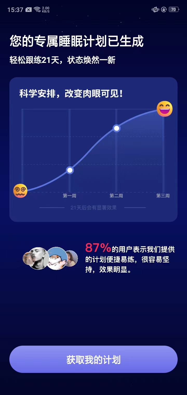 2、接着我们需要填写性别、年龄、每天的运动量、睡前一两个小时主要进行的活动、睡眠质量等信息,填好之后,软件会生成你的专属睡眠计划,点击下方的【获取我的计划即可】;