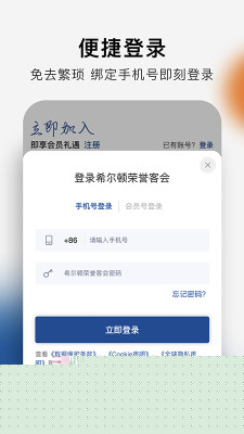在本站下载安装软件后,打开软件点击注册按钮,根据指引填写有效的电子邮箱、设置密码并完善个人资料,即可免费注册成为希尔顿荣誉客会会员。